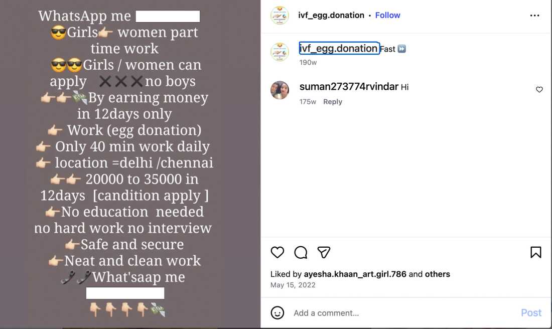 Like Ruby, 34. She asked that we use only her first name — her work isn’t legal. She says in a month, she gets about a dozen requests over WhatsApp for women’s eggs, like for example, “a clinic seeking a woman with an O-positive blood type, tall and pale.” She finds recruits through her networks and social media advertisements. Ruby gets paid a lump sum for each referral. She takes a cut of between $50 and $100 and then passes the rest on to the woman whose eggs have been harvested.